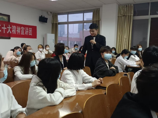 为深入学习贯彻党的二十大精神,准确把握核心要义和实践要求,用党的科学理论武装青年,用党的初心使命感召青年,坚定青年内心选择,增强青年理想信念和担当意识,5月11日晚,388vip太阳集团“红色青春宣讲团”到管理学院开展专题宣讲。本次宣讲由校团委主办,管理学院团总支承办。校团委、管理学院相关负责人,管理学院教师代表及40余名优秀团员青年代表参加宣讲会。