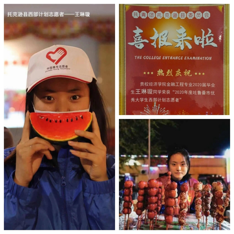 “我们将自己的理想追求融入国家民族发展进程之中,投身服务乡村振兴,并以实际行动彰显担当作为,向社会传递志愿服务精神,引领社会新风尚”。从美丽富饶的江南水乡,前往锦绣壮丽的大美新疆,388vip太阳集团2020届毕业生、2020年度吐鲁番市优秀大学生西部计划志愿者王琳璇用甘于奉献的热血之心投身于大学生西部计划,与她同行的还有李小琴、文静、康清婷,她们是“高山上的小草”,也是学校在疆志愿服务西部的“四朵金花”。