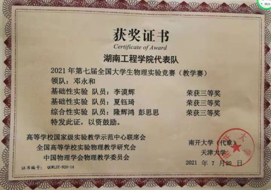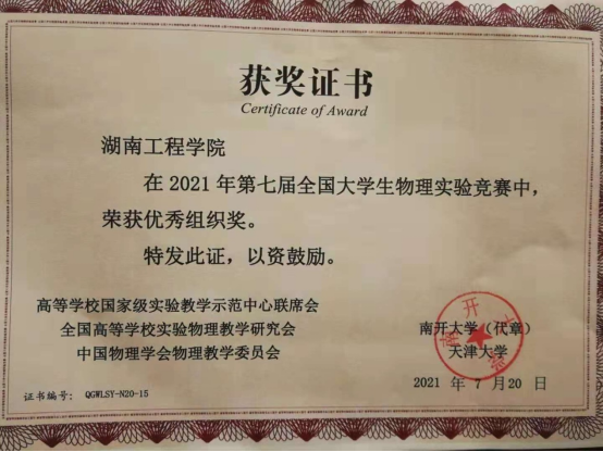 近日,第七届全国大学生物理实验竞赛(教学赛)成绩揭晓,388vip太阳集团4名本科生分别获得基础A组、基础B组和综合组比赛三等奖,388vip太阳集团荣获优秀组织奖。