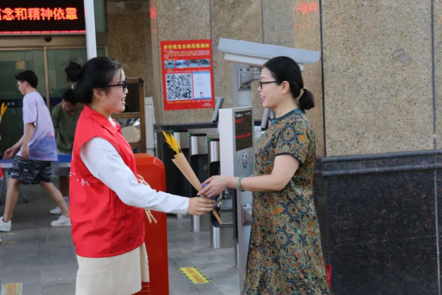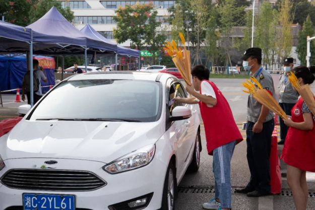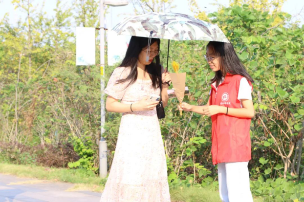 早上7点20分,志愿者们早早地就来到了目的地进行准备工作、静候老师们的到来。伴着早晨灿烂明媚的阳光,老师们陆陆续续地来校,在路过“送福站”时接过志愿者们手中能代表同学们心意的贺卡和麦穗,有的同学还特地给老师们写了长长的感谢信让志愿者们帮忙传达。