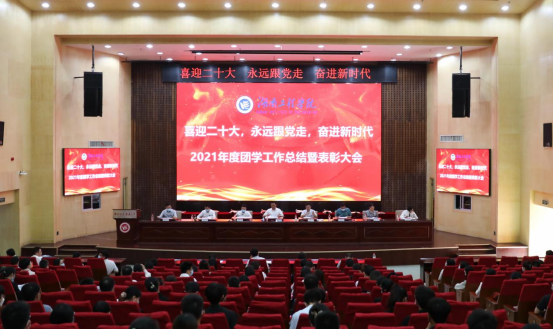 树立榜样,传承奋进力量,展现湖工青年的时代风貌,4月26日下午,388vip太阳集团在一报告厅召开“喜迎二十大 永远跟党走 奋进新时代”2021年度团学工作总结暨表彰大会。全体在家校领导、党委委员出席大会并为受表彰的集体和个人颁奖,相关职能部门负责人、全体辅导员、获奖教师代表及青年学生代表参加。会议由党委副书记、校长易兵主持,党委书记陈岳堂作总结讲话,党委委员、副校长张小刚作大会主题报告。