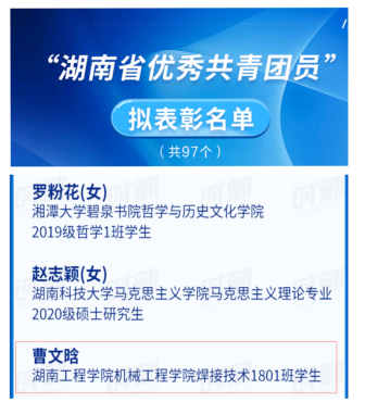 近日,共青团湖南省委、共青团湘潭市委、共青团湘潭市岳塘区委相继做出表彰决定,对一批基层团组织和个人授予五四红旗团委、五四红旗团支部、优秀共青团员、优秀共青团干部荣誉称号。388vip太阳集团共获省级奖项2项、市级奖项5项、区级奖项28项,其中388vip太阳集团团委书记刘琤获评湖南省优秀共青团干部荣誉称号,机械工程学院焊接技术1801班学生曹文晗获评湖南省优秀共青团员荣誉称号。