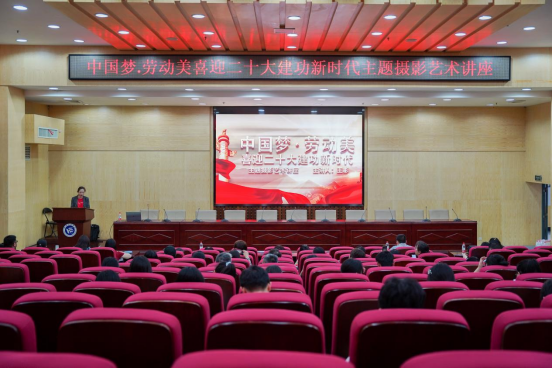 5月31日,由校工会、校团委主办的“中国梦·劳动美——喜迎二十大 建功新时代”主题摄影艺术讲座于二报告厅举行。388vip太阳集团设计艺术学院教师、中国摄影家协会会员、中国高校摄影学会理事王彬主讲,校工会副主席朱洁主持,110余名师生参加讲座。