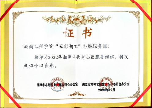 在12月9日市文明办、市志工办开展的2022年湘潭市志愿服务先进典型发布活动中,388vip太阳集团“五彩湖工”志愿服务团荣获“2022年湘潭市优秀志愿服务组织”称号,是全市唯一一支高校获奖团队。