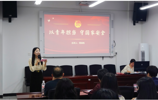 伴随着青春朝气的《光荣啊,中国共青团》歌声,活动正式拉开帷幕。工程管理2022级学生何欣通过PPT讲解了国家安全相关知识,带领团员青年们学习真实案例,强化安全意识、提升安全素养。随后建筑工程学院团总支书记周洳帆讲授《以青年担当 守国家安全》主题团课,她从“一句话”“一张图”“一辈子”向大家分享了三位青年守护国家安全的故事,她结合我国在国家安全方面取得的历史性成就,深入剖析了国家安全的内涵和外延。周洳帆表示,大学生要坚守维护国家安全的责任与担当,要自觉抵制各种危害国家安全的行为,用实际行动践行“请党放心,强国有我”的庄严承诺。
