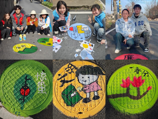下午,管理学院“蓝丝带联盟”志愿团队携手学院学生第二党支部前往下摄司村开展 “‘井’上添‘画’,助力乡村振兴”志愿服务活动,以“志愿服务+美育实践”的方式助力美丽乡村建设。活动中,青年志愿者和学生党员围绕二十四节气、社会主义核心价值观、美丽乡村等主题进行井盖绘制创意设计,在带队老师和村委会工作人员的指导下进行艺术创作。经过井盖清洁、线稿勾勒、涂抹色彩等,完成了二十四节气井盖美化工作,为整洁的乡村小路增添了色彩和趣味。“这井盖真漂亮,你们画得真好看!”“我来拍个短视频宣传一下!”“你们还会来吗?这面墙空荡荡的,你们也给画画呀!”村民们纷纷表示。