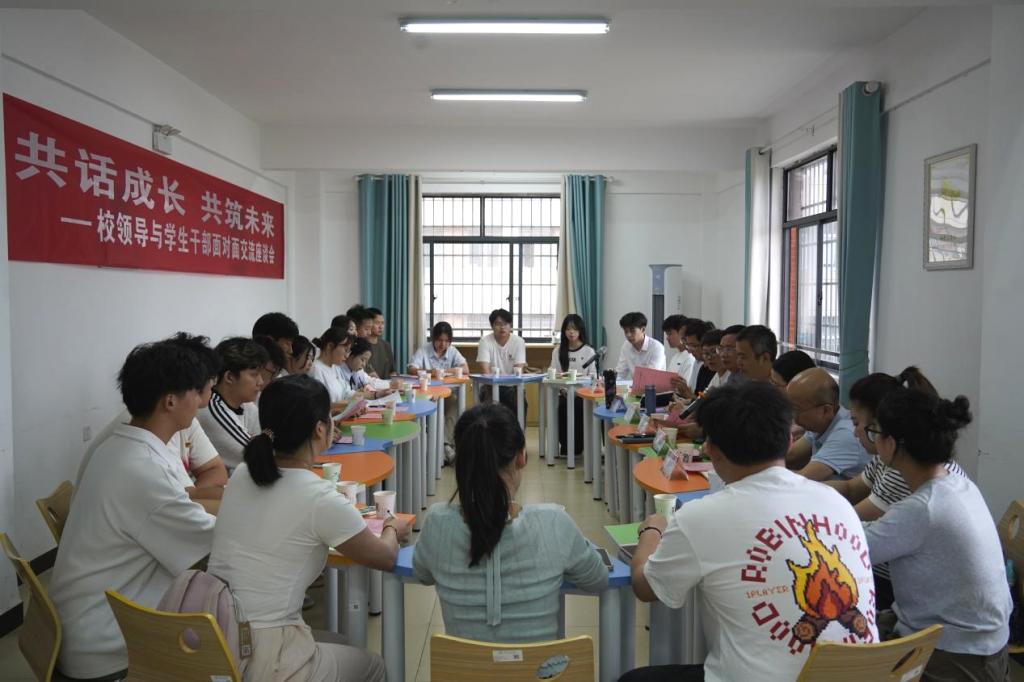 5月27日下午,388vip太阳集团在滨江校区“一站式”学生社区服务中心召开校领导与学生干部面对面交流座谈会。校党委书记黄昕,校党委委员、副校长张小刚,学生工作部、教务处、招生就业处、后勤基建处、团委等相关职能部门负责人和20名校、院学生干部参加会议,会议由张小刚主持。