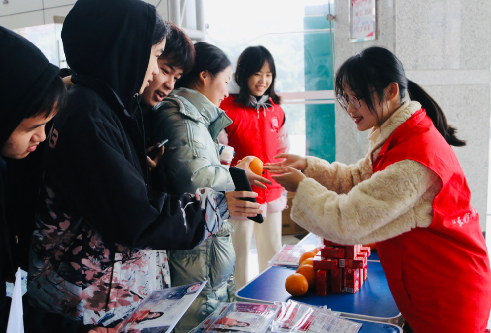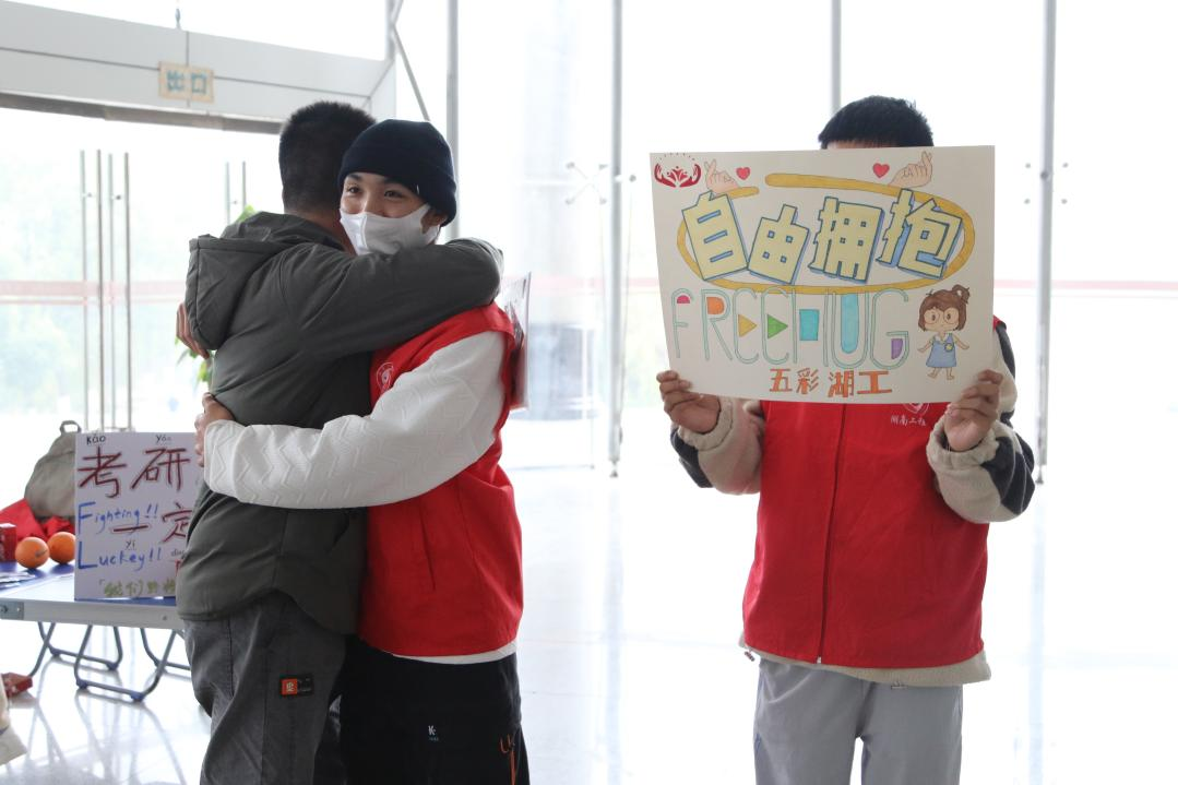 晨光熹微,云蒸霞蔚。冬日的寒意在湘江之滨盘旋,却丝毫没有影响湖工学子考研复习的热情。早晨七时许,图书馆门口已满是学子们奔波的身影。为慰问紧张备考的考研学子,缓解考前精神压力,增强考研必胜的信心,小青团带领“五彩湖工”志愿者们,秉持“奉献、友爱、互助、进步”的服务理念,于图书馆开展了“Free Hug自由拥抱”“赠考研加油包”“送旺仔”“送橙子”等温暖助力活动,志愿者们守在图书馆大厅,给路过的考研学子献上拥抱,为一天的奋斗“开好头”。
