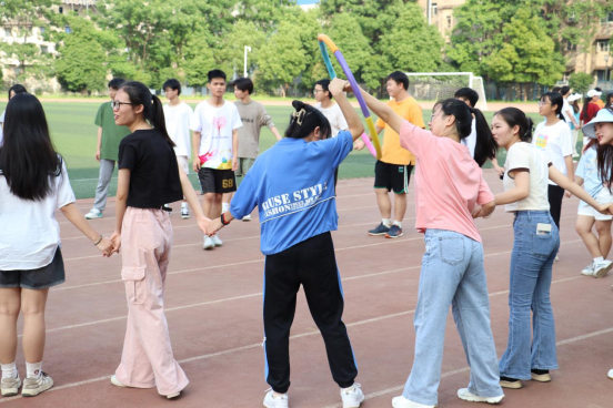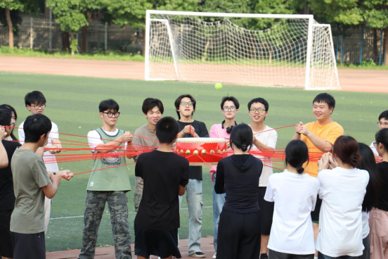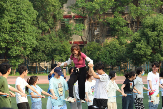 本次活动以“交往与合作”为主题,共设四个环节。参与者们被分成三个大组,围成两个圈面对面进行自我介绍,相互认识。随后,参与者们手拉手,一起传递呼啦圈,在合作传递中,拉近彼此的距离。为了进一步提升协作能力,凝聚团体力量,团队开展了击鼓颠球项目,参与者通过各牵一根绳子将鼓支撑起来进行颠球,让大家在一个个颠球中学会配合、学会等待,并重拾信心,在一次次落球中越挫越勇。最后,团队开展了“走钢丝”项目,大家围坐一圈,拿起同一根绳子进行节奏练习,并在朋辈辅导员的辅助下挑战走钢丝活动,体验信任与支持,探索技巧与玩法。现场气氛热烈,初夏的炎热也挡不住同学们的热情与青春的活力。