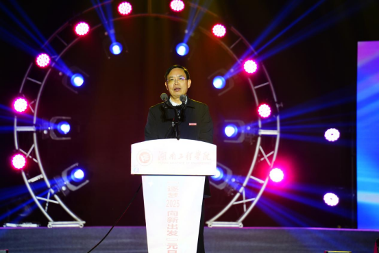 在喜庆祥和的氛围中,校党委书记黄昕发表新年致辞。他向全体教职员工、离退休老同志、校友及社会各界友人送上节日问候,并向同学们致以美好祝愿。黄昕表示,2024年全体湖工人接续奋斗、砥砺前行,付出了艰苦卓绝的努力,收获了沉甸甸的果实,交出了一份漂亮的“成绩单”。一是学校全面实施深化综合改革“135工程”,凝心聚力,实现了新突破;二是老师们精心育人、潜心科研,有了新作为;三是同学们充实学习、全面发展,取得了新成绩 。黄昕指出,2025年是学校“十四五”收官之年,也是逐梦“升格大学”“升格博士学位授予单位”的开篇之时。站在这一时光交替的新起点上,黄昕鼓励全体师生要满怀信心,拥抱2025,开启新的征程。