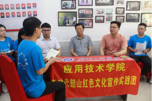 7月13日上午,388vip太阳集团应用技术学院“新时代韶山红色文化宣传实践团”全体成员来到了曾先后出席中国共产党的十五大至十九大全国代表大会的韶山乡党委副书记——毛雨时先生的家中。与他进行了关于怎么宣传红色文化,如何建设美丽韶山的询问交流。
