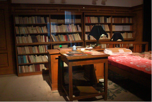 毛主席的床也陈列在遗物馆内。虽是木板床,却与普通的床不一样,由于毛主席喜欢在床上办公、看书,所以他的床很宽,书堆得很高。工作人员就把主席睡的这边加高了,低的这边用来放书,以免睡觉时书压到主席。毛主席一生喜欢睡硬板床,这既是他一辈子的生活习惯,更是他不务华靡、安于清贫的精神体现。