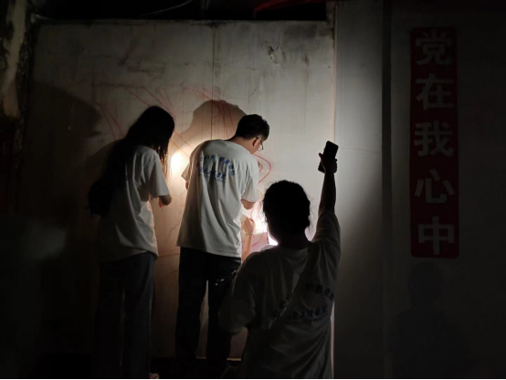 夜晚,天上繁星点点,团队成员仍在忙碌工作。从下午持续工作到深夜,大家强撑着身体的不适,抵住困意,紧握笔刷,借助手机手电筒的光全心全意地投入到绘画中。光把他们的影子映射在墙壁上,影子和墙绘交错在一起,构成了一幅独特的风景画。