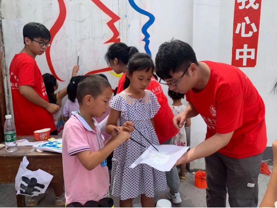 “老师,给我一支笔。”“老师,是用这个颜料吗?”“同学们,注意要竖着涂颜料,不要画出边界”。孩子们询问的声音和志愿者们讲解的声音此起彼伏。汗水顺着大家的脸庞流了下来,衣衫虽已湿透,但孩子们的眼睛里却充满热情,他们有模有样地学着老师的样子认真描绘。实践队的志愿者耐心指导孩子们,大家的脸上都充满了笑容。