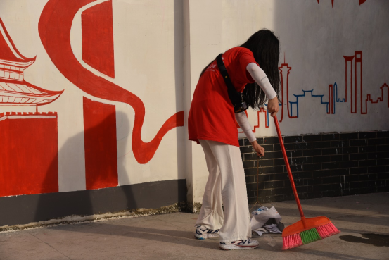完成绘画工作后,志愿者清扫绘画场地