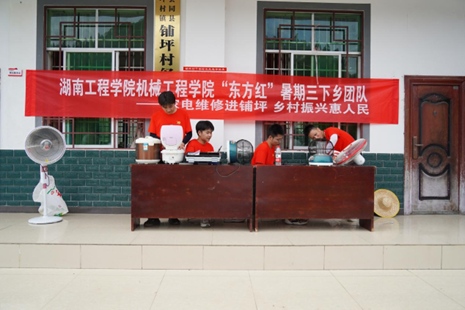 聚焦惠民帮扶,彰显青春美。青春因奉献而美丽。为助力乡村振兴事业,锤炼学生队伍,7月15日,团队在学校乡村振兴帮扶工作驻点村怀化市会同县坪村镇铺坪村开展义务家电维修活动。在铺坪村乡村服务中心家电义务维修站,志愿者们熟练地给村民们送来的小家电卸螺丝、检测、换零件、重装、测试。天气炎热,部分年长的村民不便外出,志愿者们便带上工具将维修服务主动送上门。经认真修理和维护,故障冰箱、风扇、电饭煲、热水壶和烤火炉等家电重新正常运转、恢复工作。看着焕然一新的家电,村民们喜笑颜开,不停地向志愿者们表示感谢,有的还送来西瓜和葡萄降温消暑。维修服务中,志愿者们还不忘趁机向村民们普及家用电器的使用和保养知识。