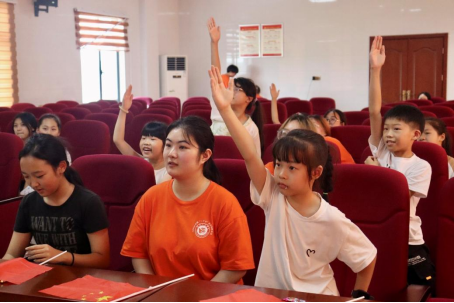 实践团因地制宜,为当地少年儿童定制“方言口语+书面语+寓教于乐”的多元化推普课堂,实践团成员通过传声筒、词语接龙、绕口令等一系列儿童喜闻乐见的互动性游戏,让孩子们在轻松愉快的氛围中学习普通话,增强孩子们的口头表达能力,提高他们对国家通用语言文化的认知和理解。