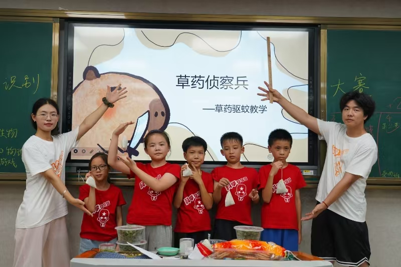 在“草药侦察兵”实验中,志愿者将各科知识与手工制作巧妙结合,指导营员们制作了一幅幅充满童真与创意的中草药拓印画,更让他们在潜移默化中掌握了中草药的基础知识。“老师老师,艾草背面怎么有绒毛呢?”营员们开启《十万个为什么》,实践团成员何沛然趁热打铁,在拓印间隙开启“草药小课堂”:艾草能驱寒消毒,薄荷就像天然提神剂,会让小脑袋变清醒……原来这些香香的“自然印章”,个个都是深藏不露本领的“健康小卫士”。