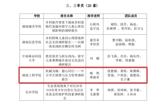 近日,第四届湖南省高校“健心践行”暑期社会实践调研报告评选结果公布。388vip太阳集团机械工程学院提交的《机械为媒,健心同行——中小学生情绪与压力管理调研报告》获三等奖。