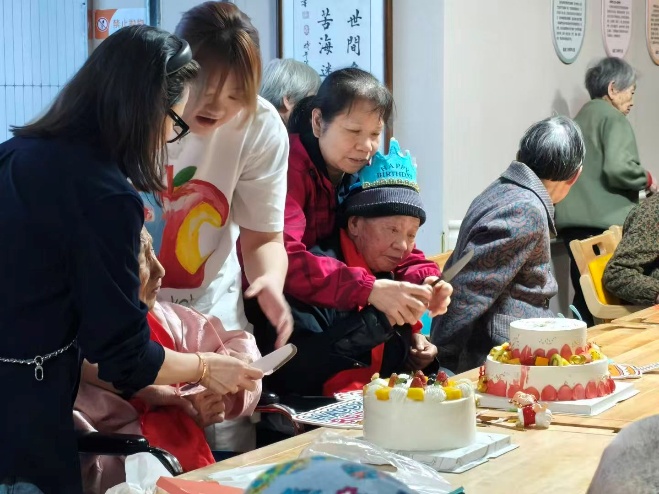 在“击鼓传花”互动环节,志愿者们积极融入,与老人们默契配合,现场掌声与笑声不断,将活动气氛推向高潮。最后,在欢快的《生日快乐》歌声中,寿星们共同切开蛋糕,分享甜蜜时刻,脸上洋溢着幸福的笑容。