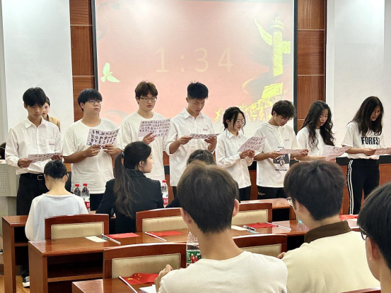 宣讲活动开始,全体成员手举团旗,齐唱团歌。随后,宣讲团成员时冰鑫、刘习羽作《两个结合——开辟马克思主义中国化时代化新境界》《根本保证——牢牢把握以伟大自我革命引领伟大社会革命的重要要求》的主题宣讲。他们倡议,全体青年团员要自觉用习近平新时代中国特色社会主义思想武装头脑,为奋进新征程凝心聚力,踔厉奋发、勇毅前行,为全面建设社会主义现代化国家,实现中华民族伟大复兴而团结奋斗。红色语录传声筒环节,同学们参与热情高涨,现场气氛热烈。“大江歌罢掉头东,邃密群科济世穷……”同学们在参与活动中品读先辈寄予后代的厚望,感悟革命者奋斗历程的缩影。最后,同学们用书签纷纷写下自己的学习感悟,记录自己参加宣讲活动的收获并交流分享。